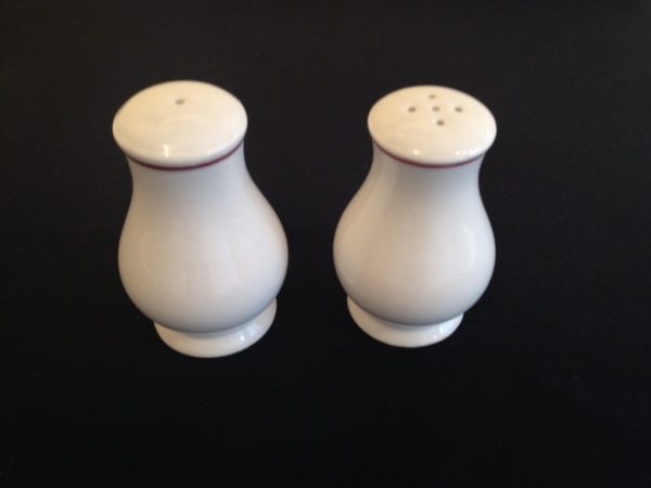 Salt & Pepper set for the table. Good quality budget crockery hire for your event at a great price. Affordable and practical salt & pepper set with a feature red/burgundy band. We stock a full matching range and the items also complement our plain white china and vintage ranges alike.